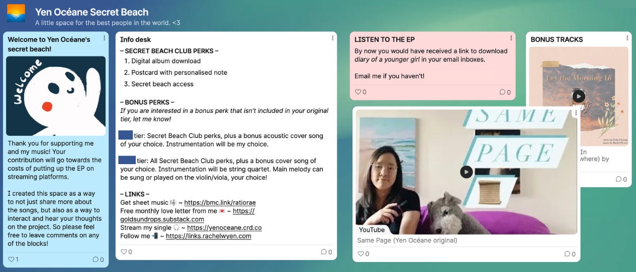 Here’s a sneak peek of a bonus website I’m working on for anyone who purchases the album via these paid tiers. I’ve decided to host it on Padlet for now as I like that anyone can interact with the blocks and leave comments without creating an account. (Say no to signing up for more things than you need!!) You can pre-order the first tier which will give you access to the website here.